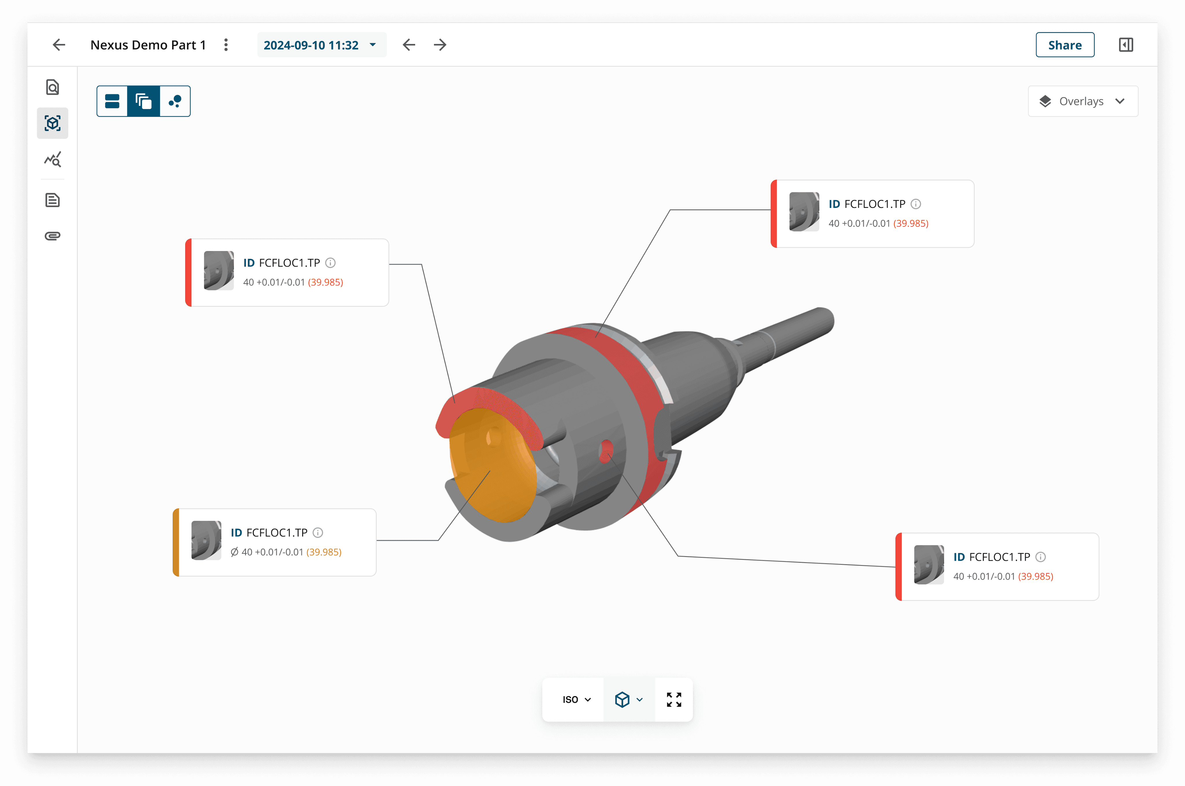 The CAD view shows how certain elements of the measured part deviate from the defined tolerance.