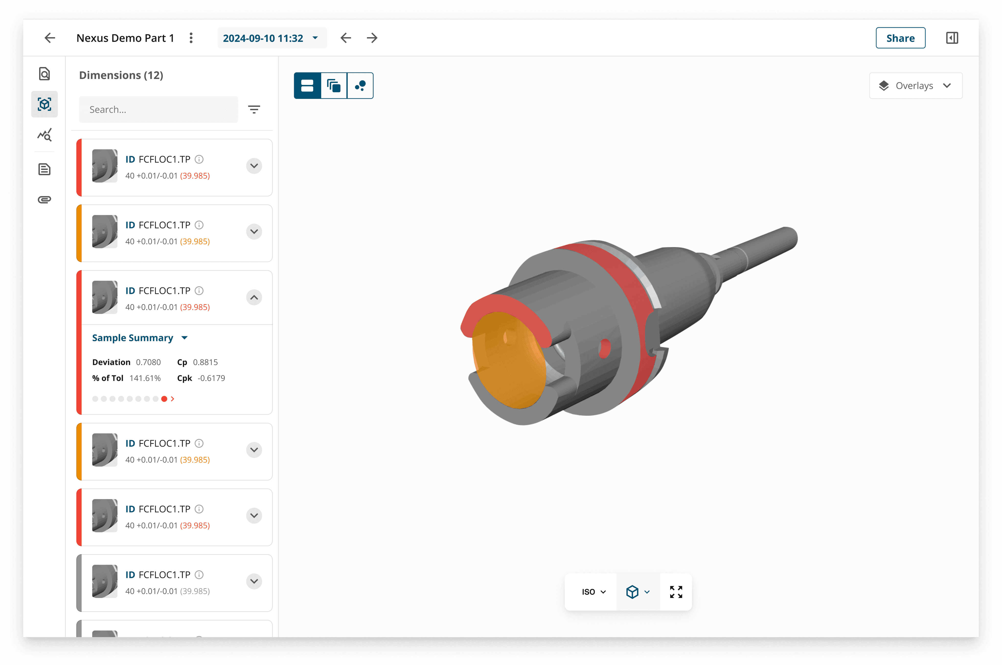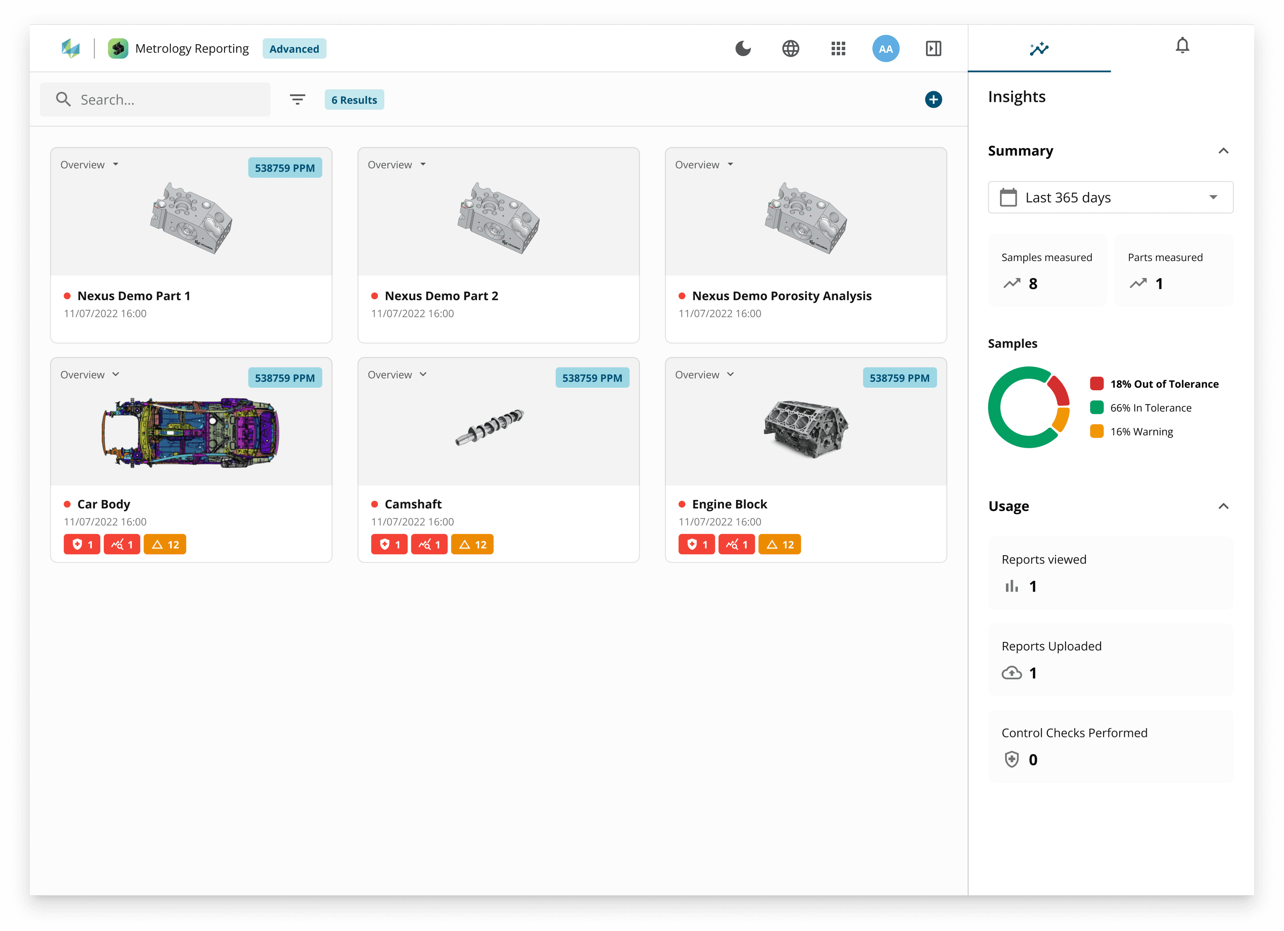 The part dashboard allows users to check the overall quality of their measured parts at a glance before diving deeper into individual reports.